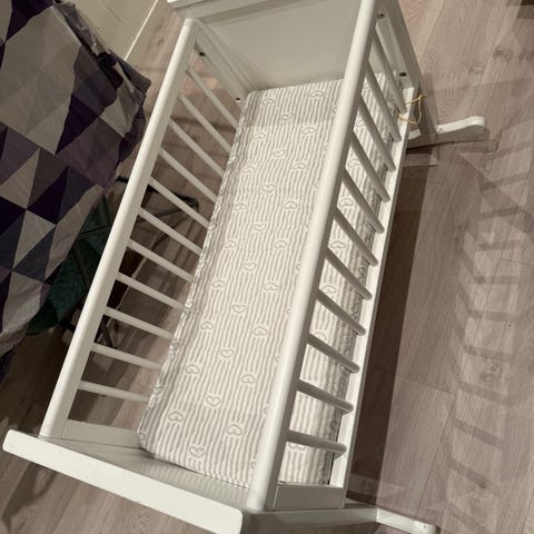 Vugge i hvitmalt tre til salgs.