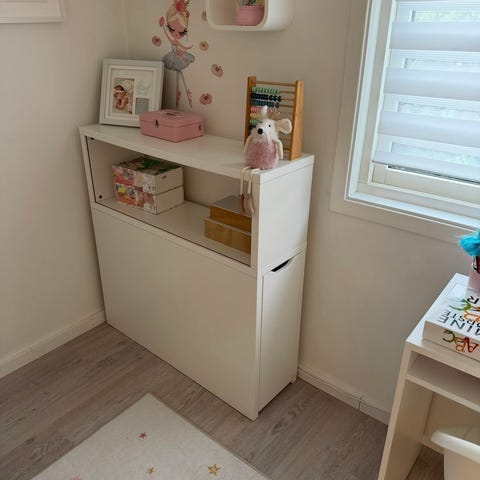 IKEA oppbevaringshylle med plastbokser hvit grønn rød