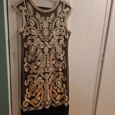 4. Nyprodusert 20talls kjole, sort med gullmønster (perler og paljetter)