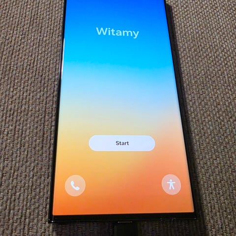 Samsung mobiltelefon. Enheten har stor skjerm i front og flere kameraer på baksiden. Basert på bildene fremstår telefonen i en mørk farge. Det er synlige merker og skade på ett av kameraobjektivene på baksiden. Ytterligere tekniske spesifikasjoner som modell, lagringskapasitet og skjermstørrelse er ikke oppgitt.