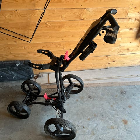 Golftralle med 3 hjul i sammenleggbar utførelse. Trallen har håndtak med konsoll for småting, feste for bag og store hjul som gir stabilitet på banen. Den kan foldes sammen for enklere transport og lagring. Farge: svart med detaljer i rødt og grått.
