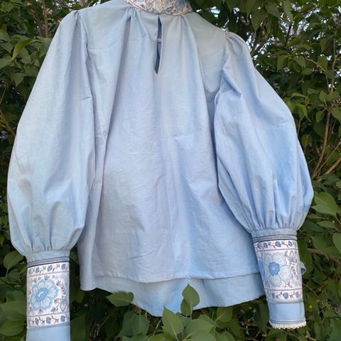 🤍 Blått hovedprogram med krage og mansjett i blomstermønster