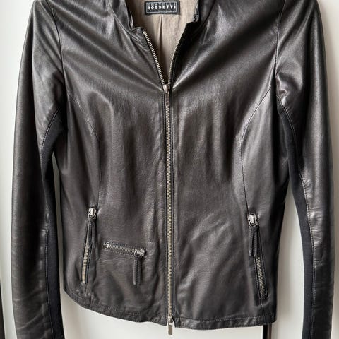 Claire skinnjakke for dame i størrelse 40. Kjøpt på Claire.0 Jakken er svart og laget i skinn. Modellen har glidelåslukking foran, to glidelåslommer i siden og glidelås nederst på ermene. Strukturert overflate og paneler gir et markert snitt. Passer som ytterjakke i overgangssesonger eller som et ekstra lag over topp eller kjole.
