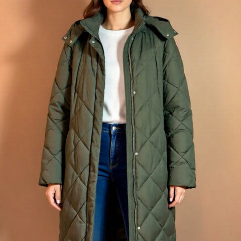 Ganni quiltet kåpe for dame i størrelse M. Kåpen er grønn og laget i polyester. Modellen har oversized, rett passform med skrå- og rutete quiltet mønster. Den har høy krage, glidelåslukking i front kombinert med trykknapper øverst, samt store påsydde lommer foran. Lengden går godt ned på leggen, og designet gir god plass til lag-på-lag under. Egnet som ytterjakke i overgangssesonger og milde vinterdager.