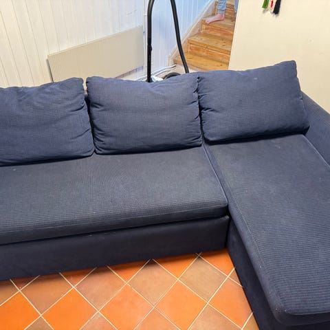 En mørkegrå 3 Seters sofa, selgest.. ikke synelig brukt, å vældig go å sette i før vårres rumpestumpen...