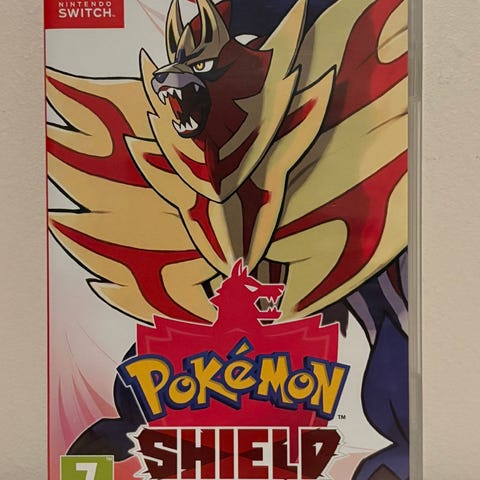 Nintendo Switch Pokémon Shield spill. Fysisk spill for Nintendo Switch-konsoll. PEGI 7 aldersgrense. Eventyr- og rollespill i Pokémon-serien, hvor spilleren utforsker Galar-regionen, fanger og trener Pokémon og deltar i kamper.