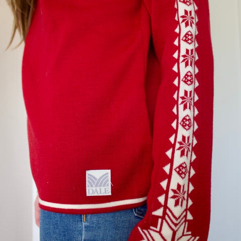 Dale of Norway ullgenser for dame i størrelse XL. Genseren er flerfarget med rosa som hovedfarge og tradisjonelt mønster i flere nyanser. Strikket i ull med ribbestrikkede kanter nederst, på ermene og i halsen. Egnet til hverdagsbruk og som varm genser på kjølige dager.