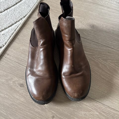 Fila støvler i størrelse 41. Modellen er ankelhøy med snøring og kraftig såle. Fargen er beige/brun med mørk polstret kant øverst rundt ankelen. Overdelen fremstår som skinn- eller semsket-lignende materiale (eksakt materiale ikke oppgitt). Egnet som hverdagsstøvler eller fritidssko i kjøligere vær.