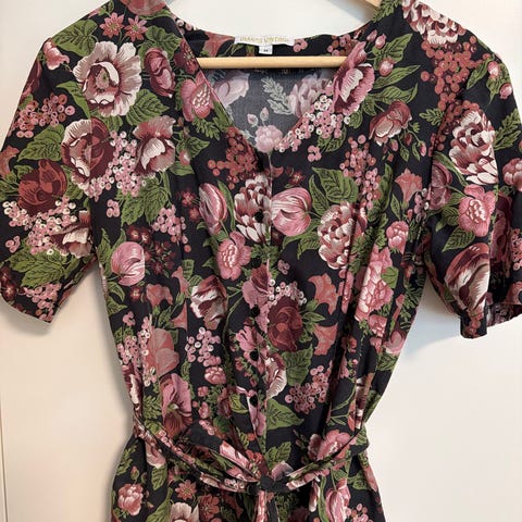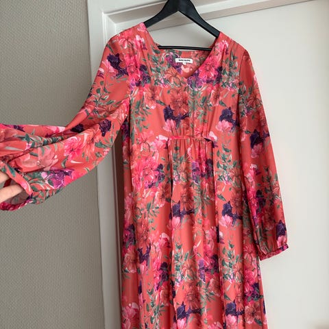 Vintage sommerkjole for dame i størrelse M. Kjolen er flerfarget med blomstermønster i hovedsaklige rosa og jordtoner. Den er laget i polyester og har lett, gjennomsiktig ytterstoff med fôr under. Overdelen har rynket elastisk parti og knyting foran. Ermene er lange med volangkant nederst. Skjørtet er langt med volang nederst som gir ekstra vidde. Passer som sommerkjole eller til hverdagsbruk.Passer s/m