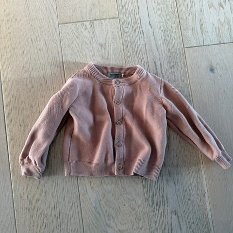 Lillelam ulljakke for barn i størrelse 86. Jakken er i rosa farge og laget i ull. Modellen har glidelås foran, lange ermer og ribbekanter nederst og ved ermene. Kan brukes både inne og ute som et ekstra lag for varme.