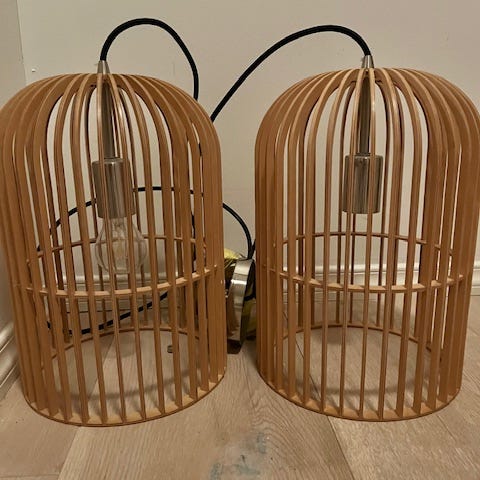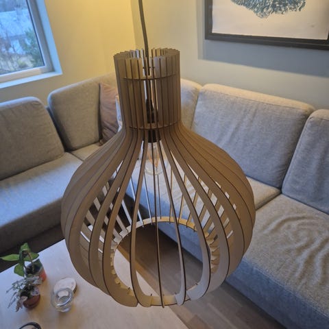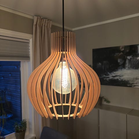 Taklamper pendel i trelameller. Lampene har en organisk, rund form med åpne lameller som gir godt lysutslipp og synlig lyspære. Én lampe har ca. diameter 35 cm, den andre har ca. diameter 25 cm. Egnet som belysning over bord, i stue eller andre oppholdsrom. Bruker standard lyspære med synlig filament (type og sokkel avhenger av medfølgende/valgt pære). Leveres som pendellamper for montering i tak. Kan sendes mot tillegg