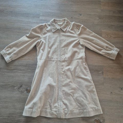 Lommer i siden, glidelås helt ned. Modellen har krage og trekvart lange ermer med lett puff og strikk nederst. Lengden er over kneet.