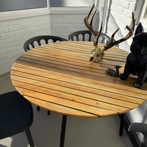 Sort bord er 68 sm diameter, lite bord er 30 cm diameter, høyde på begge er 60 cm. Liten skade på store bordet i mosaikken men bare sjarmerende. Vi har brukt «bål-pannen» i midten til oppbevaring med isbiter og drikkevarer.