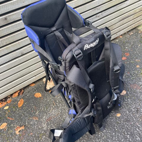 Bergans bæremeis for barn i blå og rød farge.. Egnet til turer og hverdagsbruk der barn skal bæres på ryggen.