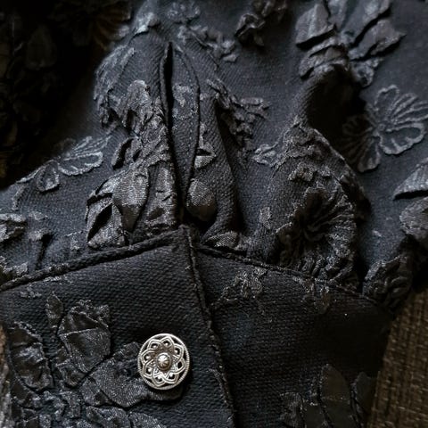 Skjorte i bomulls viskose, sort bunn, sorte blonder, pynte knapp på mansjett. Overvidde 128cm, lengde 62cm, mansjett 23cm, lengde arm fra skulder 65cm, skulderbredde 39cm. Sender med fiks ferdig.