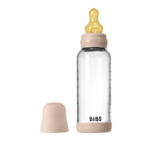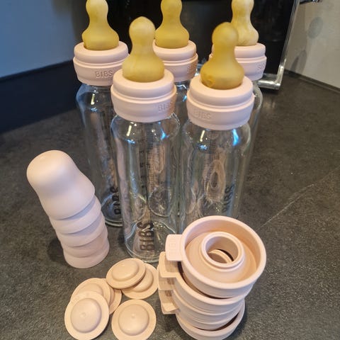 Stor BIBS pakke med 8 stk. tåteflasker i glass, flasketuter, «Bottle sleeve» og «Bottle handle».