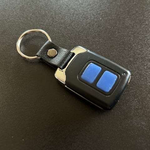 Chamberlain TX2REV garasjeportåpner fjernkontroll i sølvfarge. Fjernkontrollen er beregnet for styring av kompatible Chamberlain garasjeportåpnere. Den har to knapper for betjening av én eller to porter/funksjoner.