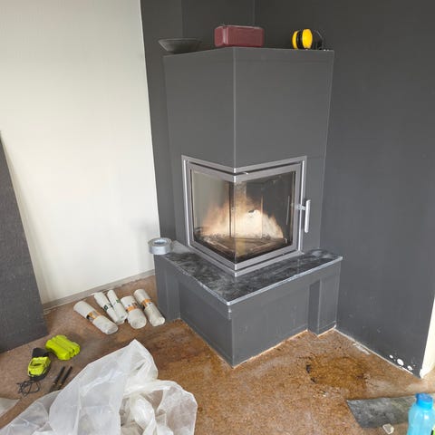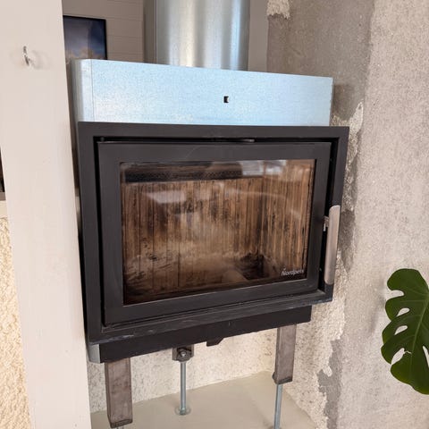 Rentbrennende peisinnsats fra Jøtul, med to glass: foran og til høyre sett forfra.
