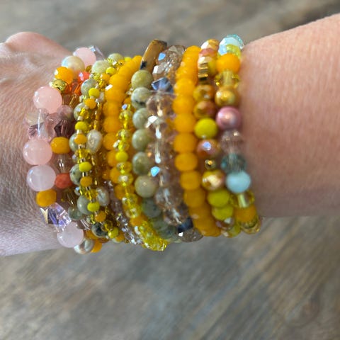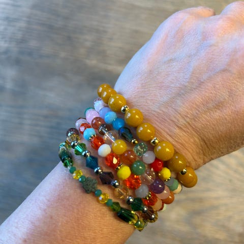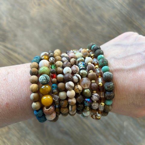 Selger noen armbånd laget av meg, med forskjellige stener / perler som jeg har samlet opp gjennom mange år. Noen ekte stener, noen glassperler og metallperler.. Her er også lavastein.