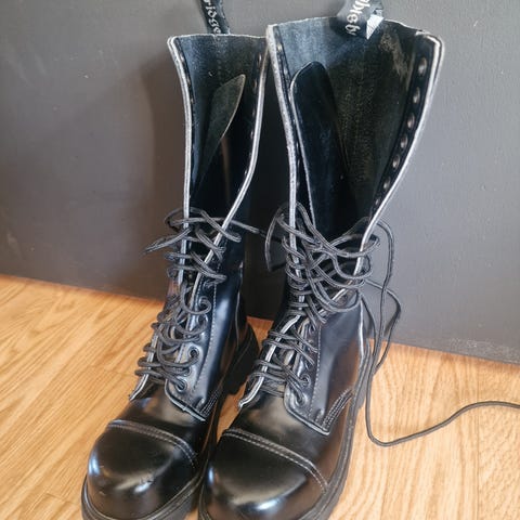 Veldig kule «punkboots» til salgs. Ikke merket med størrelse og produsent, men størrelsen er en romslig 39.