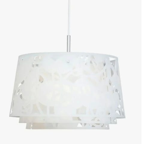 Louise Campbell taklampe i hvit utførelse. Lampen har en rund skjerm med utskåret mønster og en diameter på ca. 60 cm og høyde på 36 cm. Designet av Louise Campbell. Egnet som pendel over spisebord eller i oppholdsrom der det er behov for jevn allmenn belysning. Bruker standard tak oppheng med ledning fra taket. Det er en sprekk i lampen, men det er kun synlig når man vet at den er der. Lampens ny pris er 13 000,-.