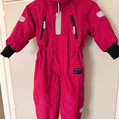 Polarn O. Pyret parkdress/skalldress med fleecefor som kan tas ut. Perfekt dress for overgang vinter/vår og høst. Medfølger en tynn balaclava i ull og skallvotter størrelse 1-2 år.