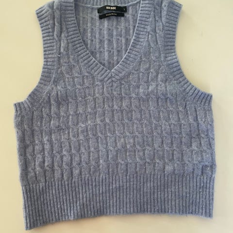 Hvit og blÄ strikket vest i ren, 100% ull, knappestolpe m. blÄ "knute"-knapper
