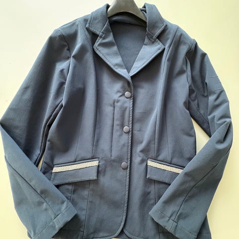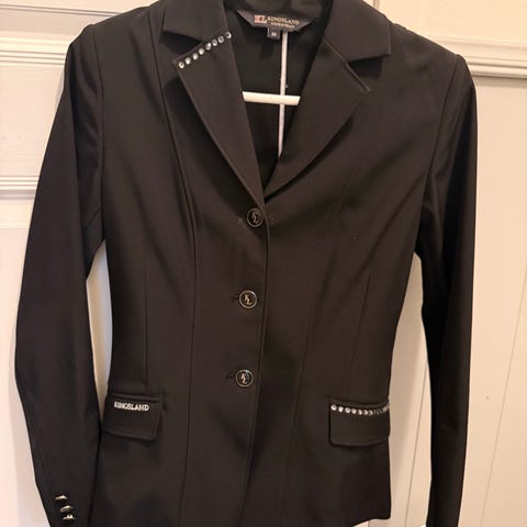 Equiline ridejakke i svart stoff med kontrastkant langs lommene og mørk krage. Jakken har knepping foran med tre knapper og klaffelommer.