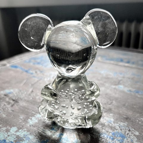 Søt vintage glassfigur formet som en hund på fasettert base.