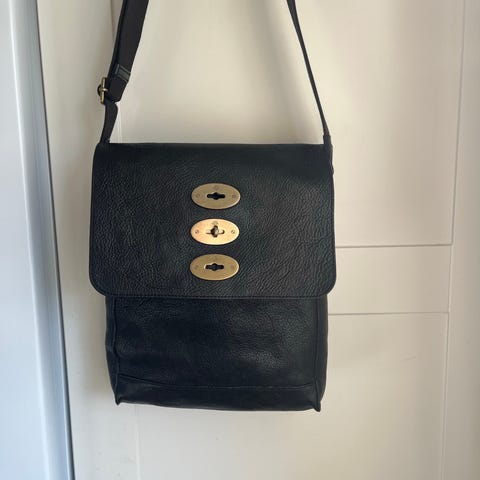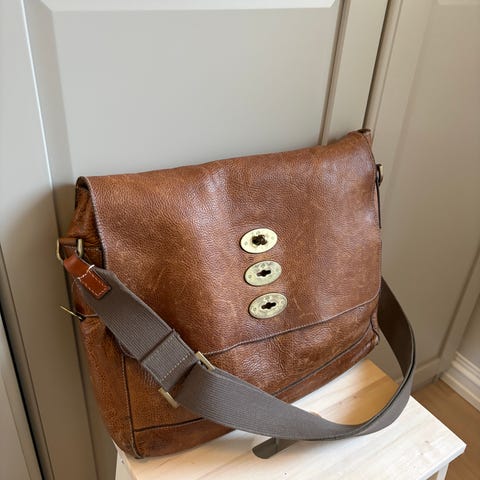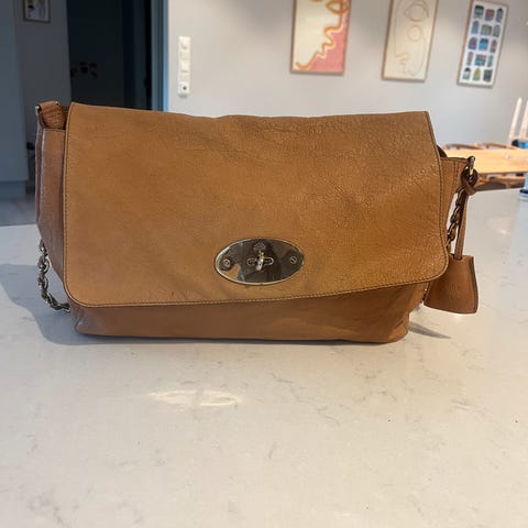 Mulberry Brynmore skulderveske i lær for unisex. Vesken er laget i brunt skinn med klaff og karakteristiske metallspenner i front. Justerbar skulderrem i samme materiale. Baksiden har en stor utvendig lomme. Innvendig er vesken uforet med semsket skinnpreg og har en enkel, romslig hovedlomme. Egnet til daglig bruk, med plass til personlige eiendeler som lommebok, nøkler, mobil og mindre nettbrett eller dokumenter.