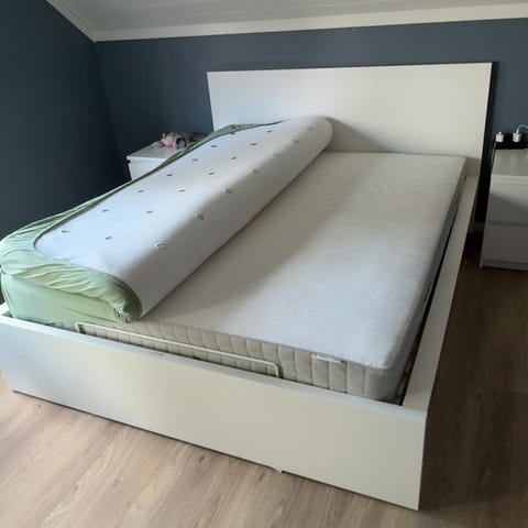 IKEA Malm 140 seng med Vesterøy madrass selges samlet. Sengen ble kjøpt brukt - mangler et strammehjul for sengeramme, men påvirker ikke bruk. Ellers i grei stand. To skuffer følger også med.