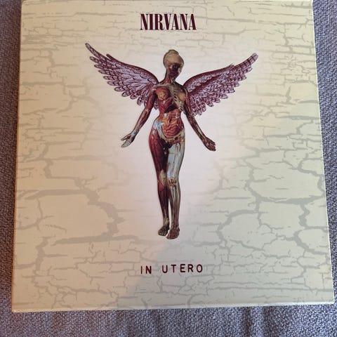 Nirvana In Utero vinylplate limited edition. Albumet er utgitt som jubileumsutgave, noe som fremgår av klistremerket på frontcoveret. Coveret har det karakteristiske englemotivet på forsiden og et detaljert grafisk motiv på baksiden. Format: LP/vinyl. Egnet for samlere og for avspilling på platespiller som støtter standard LP-plater.