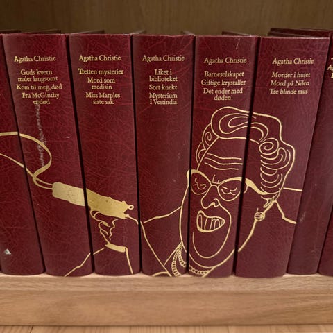 Agatha Christie bokserie med krimromaner i innbundet utgave. Bøkene har røde omslag med gjennomgående illustrasjon på ryggene. Serien inneholder flere titler samlet i et enhetlig design, egnet for lesing og som samlerutgave i bokhylle.