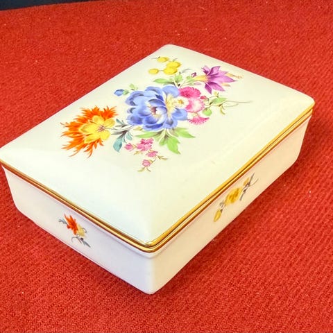 Fint gammelt metallskrin selges. Vakker blomsterdekor på lokket.