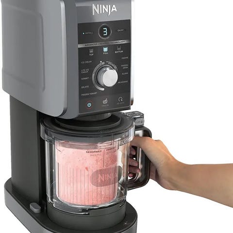 Ninja iskremmaskin med tilhørende beholdere. Maskinen har panel med flere forhåndsinnstilte programmer for ulike typer frossen dessert. Beholderne er gjennomsiktige med lokk, egnet til å fryse og blande iskrem- og dessertblandinger før bruk i maskinen. Enheten har avtakbar beholder med håndtak som festes i maskinen under bruk. Passer til tilberedning av iskrem, gelato og andre frosne desserter i mindre porsjoner hjemme.