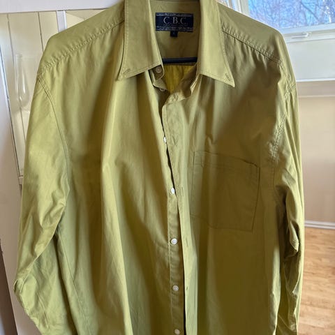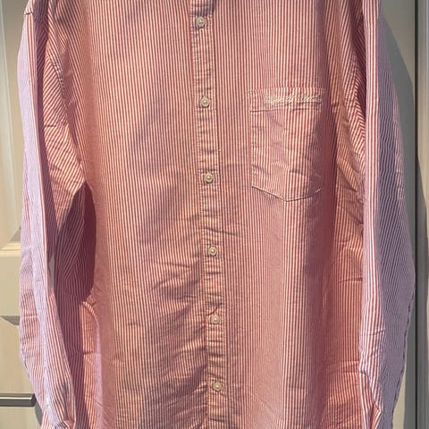 Skjorten har et fargerikt rutemønster i blått, rosa og gult. Den er kun brukt én gang og fremstår som nesten ny, uten flekker eller skader.