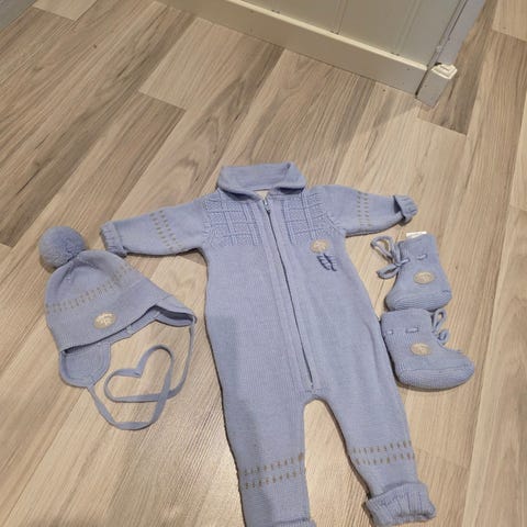 Det er noen veldig svake flekker på dressen (se bilder), lite synlig om man ikke vet om det, ikke forsøkt fjernet med flekkfjerner. Dette settet ble ikke så mye brukt, da vi hadde 2 i samme størrelse.