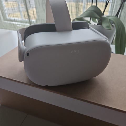 Meta Quest VR-headset i hvit farge. Headsettet har justerbar hodestropp og er beregnet for bruk med VR-spill og -applikasjoner. Medfølgende tilbehør inkluderer bæreetui, USB-kabel og strømadapter/ladekabel. Egnet for bruk sammen med kompatibel PC eller trådløs bruk der dette støttes av modellen. Passer for én bruker om gangen og kan justeres til ulike hode-størrelser.