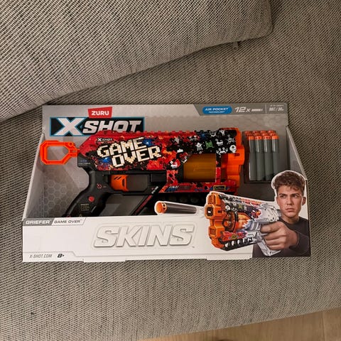 Nerf X-Shot Crusher lekeblaster med skumprosjektiler. Blasteren har roterende trommel og belte for skumprosjektiler. Pakken inneholder blaster og skumprosjektiler (48 stk ifølge esken). Anbefalt alder fra 8 år og oppover. Egnet til lek både inne og ute, der man bruker skumprosjektilene til målskyting eller lekekamper.