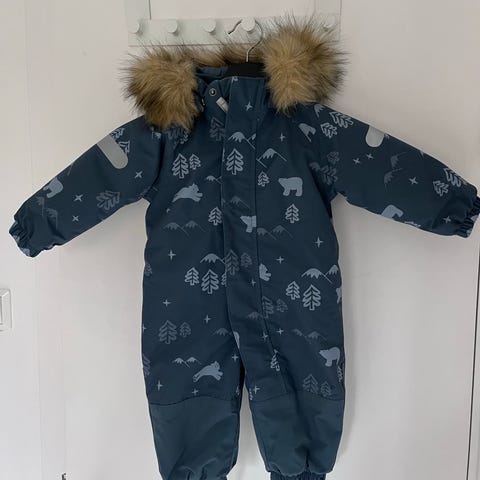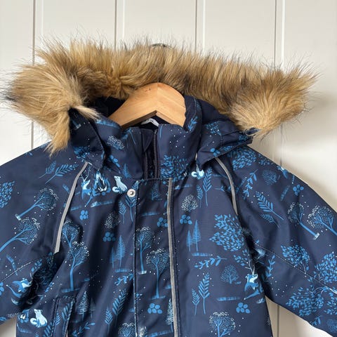 Reflex vinterdress for barn i størrelse 86. Dressen er blå med mønster og er laget i polyester. Modellen er unisex og har hette med avtagbar fuskepelskant. Glidelås foran med beskyttende klaff. Elastikk ved ermer og ben for bedre passform. Egnet som yttertøy i kaldere vær.