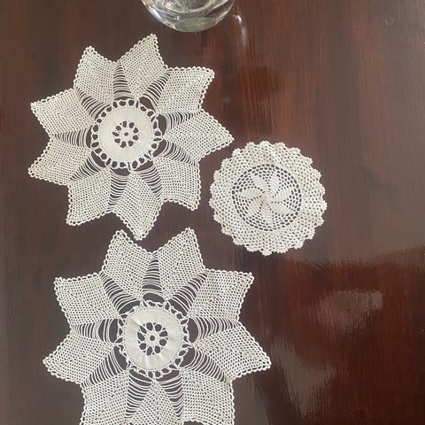 Nuppereller og heklede brikker 75 kr for alle