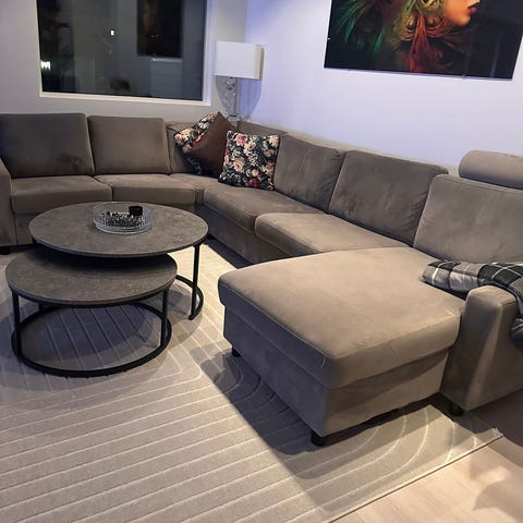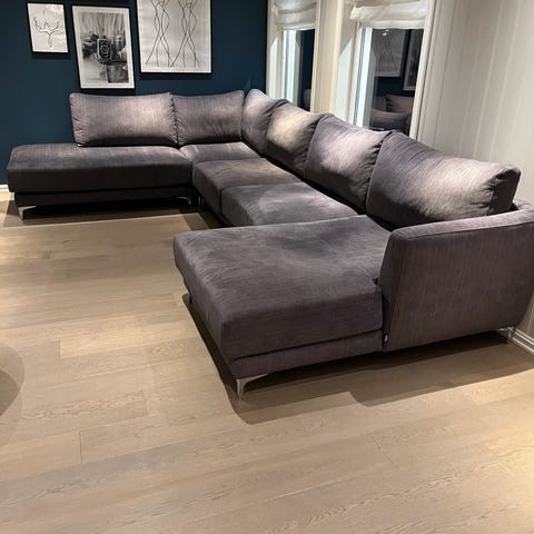 Stor sofa fra bolia med sjeselong og to seter selges grunnet overgang til mindre sofa. Den er hel og pen +veldig god å sitte/ligge på. Trekkene kan tas av og vaskes, blir ikke gjort før salg. Ingen synlige merker, noen få tråder er løse, men det har ingen betydning for utsendt. Alder aner jeg ikke. Må hentes og bæres ut av kjøper.