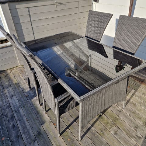 Spisebord med fire stoler for utebruk. Møbelsettet består av et rektangulært bord og fire stoler med armlener. Stolene er laget i svart kunstrotting og er tilpasset bruk på terrasse, balkong eller i hage. Bordplaten er mørk og glatt, egnet for servering av mat og drikke utendørs. Settet passer som spisegruppe til uteplass.