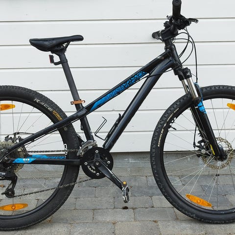 Expert barnesykkel med 26" hjul. Sykkelen har sort ramme med gule og oransje detaljer, rette styre og felgbremser foran og bak. Utstyrt med 21 gir og standard pedaler. Passer til barn som har vokst ut av mindre barnesykler og trenger en sykkel med 26-tommers hjul til bruk på vei og lett grus. Sete og styre kan justeres noe i høyde for tilpasning til rytterens størrelse.
