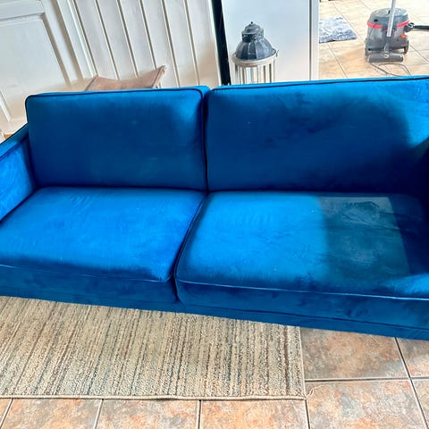 Carnella 3-seter i blå velour – Meget pen, nesten ikke brukt, selges.