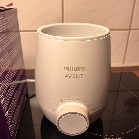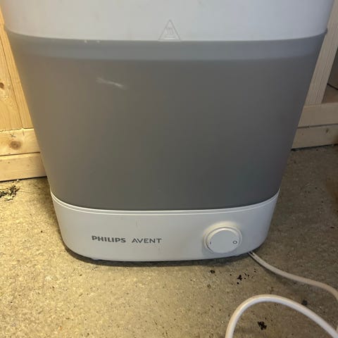 Philips Avent elektrisk sterilisator for tåteflasker. Enheten er beregnet for dampsterilisering av tåteflasker, smokker og mindre babyutstyr. Den har avtakbar beholder med lokk og plass til flere flasker samtidig. Sterilisatoren kobles til med strømledning og betjenes med knapp på fronten. Passer for husholdningsbruk på kjøkkenbenk eller lignende flate. Fargekombinasjon i lyse toner med gjennomsiktig beholder som gjør det mulig å se innholdet under bruk.