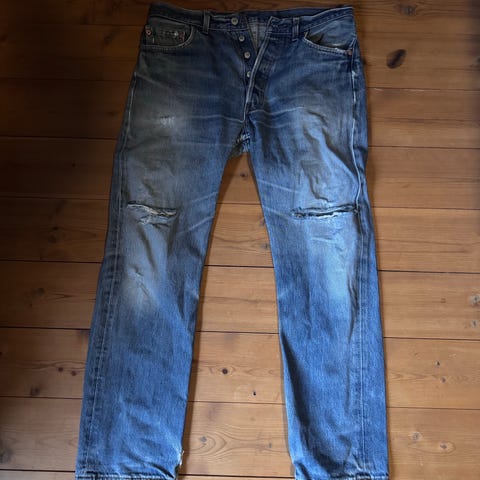 Levis 501 med bruksslitasje ,et sltehull på ene låret.