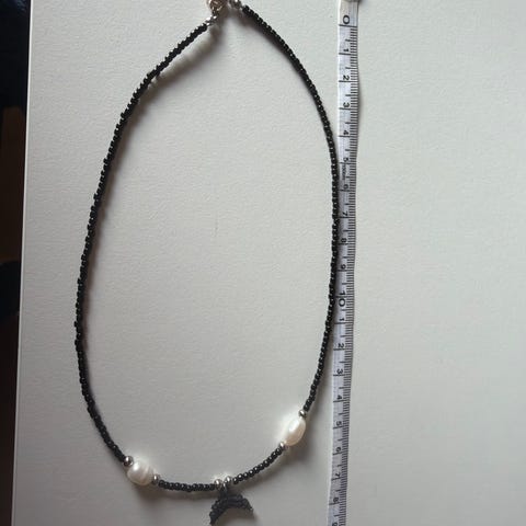 halskjede med naturperler og keramisk anheng laget av smykkestål