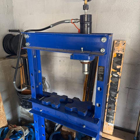 ELE Compact-1000 trykkpresse for betongprøver. Maskinen er konstruert for laboratorietesting av trykkfasthet på betongprøver og lignende materialer. Den har vertikal ramme med to søyler, trykksylinder med øvre og nedre trykkplate samt separat betjeningsenhet på siden. På bildene følger det med flere løse trykkplater/adaptere. Egner seg til bruk i materiallaboratorium, betonglaboratorium eller annen teknisk prøving der det er behov for kontrollert trykkbelastning av prøver.