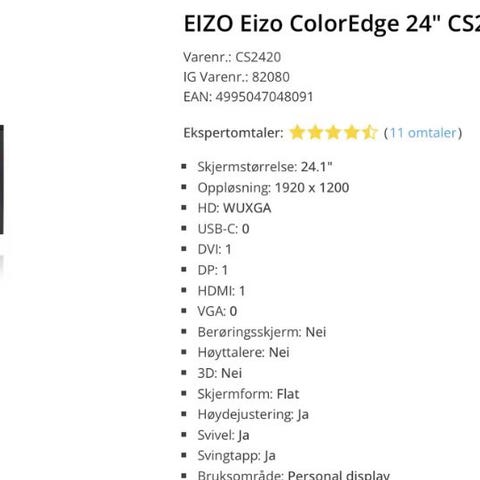Selger en profesjonell EIZO ColorEdge CS2420-BK 24" skjerm kjøpt ny i juni 2024. Den er svært lite brukt og fremstår som tilnærmet ny. Perfekt for fotografer, designere og andre som trenger nøyaktige farger og stabil bildekvalitet.